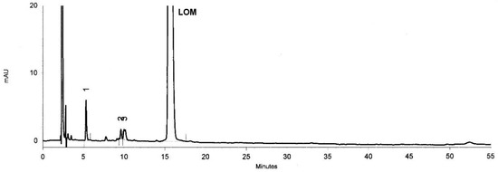 The liquid chromatography system, HITACHI, High-Technologies Corporation (Tokyo, Japan) equipped with a solvent delivery pump (L-2130), degasser, an autosampler (L-2200), a photodiode array detector (L-2455), and a column oven (L-2350) was used. The chromatographic analysis of chosen substances was performed on Kinetex 5u XB—C18 100A column, Phenomenex (Torrance, CA, USA) (250 × 4.6 mm, 5 μm particle size, core shell type), coupled with guard-column. The column temperature was 30 °C. The chromatographic separation was achieved using as a mobile phase mixture of 0.05 M phosphate buffer (pH = 3.20 adjusted with o-phosphoric acid) and acetonitrile (87:13 v/v for LOM; 80:20 v/v for BAL). The flow rate of the mobile phase was 1.0 mL∙min−1, and the injection volume was 10 µL. The analysis time was 55 min for LOM and 40 min for BAL. The samples were monitored at 280 nm for LOM and at 295 nm for BAL.