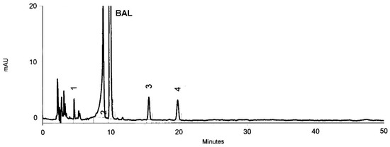The percentage of BAL degradation under the influence of ACVA after 144 h of incubation at 40 °C was 16.31%, after 48 h of incubation at 50 °C was 18.34% and after 48 h of incubation at 60 °C was 36.76%. The oxidation of BAL by ACVA led to the formation of two main degradation products (tR ≈ 5.40 min and 20.30 min) and the four others with a small amount (<0.7%) (Figure 2, Figure 3 and Figure 4).