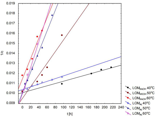 The 1/c = f(t) graph of oxidation of aqueous and methanolic LOM solutions under the influence of ACVA.