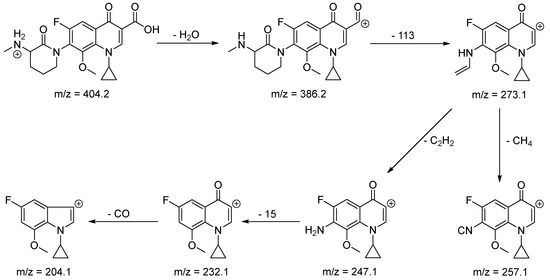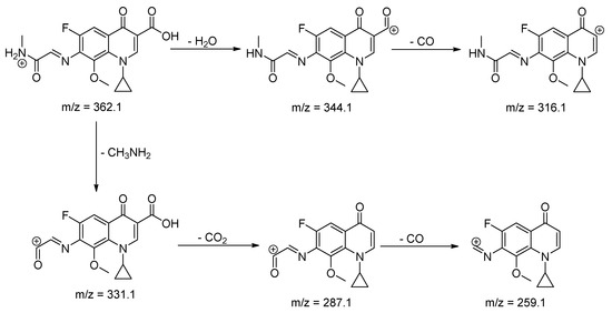 In our previous work, we published the results of oxidation of LOM by KMnO4 [27]. In this study, the oxidation of BAL while using KMnO4 in an acidic medium at RT was also checked and it was possible to try to determine the most probable structures of oxidation products. These products were compared with those that were obtained by oxidation with ACVA and H2O2. The results are summarized in Table 4. The degradation process was found to affect 3-(methylamino)piperidine moiety of BAL. In the case of degradation with H2O2, it seems, that the oxidation of the ring led to its opening yielding BP-4. Degradation with KMnO4 yielded more products of 3-(methylamino)piperidine oxidation (BP-1–BP-3), leading finally to BP-5. Degradation with free radicals generating agent ACVA yielded similar products to KMnO4 oxidation, but in a lesser amount (BP-3, BP-5). The fragmentation patterns of BAL and its degradation products are shown in Scheme 1, Scheme 2, Scheme 3, Scheme 4, Scheme 5 and Scheme 6.