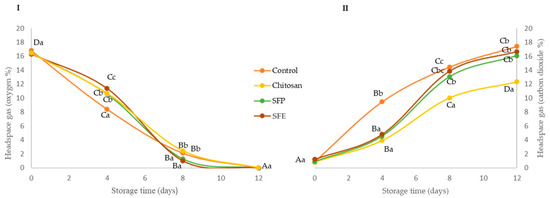 Oxygen (I) and carbon dioxide (II) headspace gas concentration (%) of Atlantic horse mackerel burgers coated with different film formulations (control without coating film, chitosan, sea fennel plant (SFP) incorporated in a chitosan-based film and sea fennel extract (SFE) incorporated in a chitosan-based film) and stored at 4 °C for 12 days. Different uppercase letters indicate significant differences (p < 0.05) over storage time in each treatment. Different lowercase letters indicate significant differences (p < 0.05) due to the treatment.