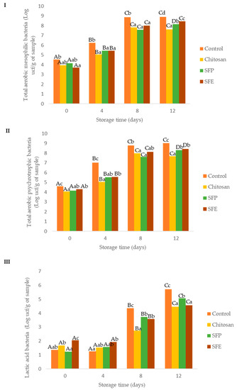 Effect of edible films on the growth of total aerobic mesophilic (I), total aerobic psychrotrophic (II) and lactic acid (III) bacteria in Atlantic horse mackerel burgers coated with different film formulations (control without coating film, chitosan, sea fennel plant (SFP) incorporated in a chitosan-based film and sea fennel extract (SFE) incorporated in a chitosan-based film) and stored at 4 °C for 12 days. Different uppercase letters indicate significant differences (p < 0.05) over storage in each treatment. Different lowercase letters indicate significant differences (p < 0.05) due to the treatment.