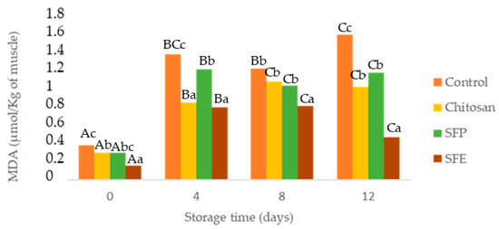 Determination of malondialdehyde (MDA) in Atlantic horse mackerel coated with different film formulations (control without coating film, chitosan, sea fennel plant (SFP) incorporated in a chitosan-based film and sea fennel extract (SFE) incorporated in a chitosan-based film) and stored at 4 °C for 12 days. Different uppercase letters indicate significant differences (p < 0.05) over storage time in each treatment. Different lowercase letters indicate significant differences (p < 0.05) due to the treatment.