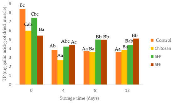 Total phenol content (TP) in Atlantic horse mackerel burgers coated with different film formulations (control without coating film, chitosan, sea fennel plant (SFP) incorporated in a chitosan-based film and sea fennel extract (SFE) incorporated in a chitosan-based film) and stored at 4 °C for 12 days. Different uppercase letters indicate significant differences (p < 0.05) over storage time in each treatment. Different lowercase letters indicate significant differences (p < 0.05) due to the treatment.