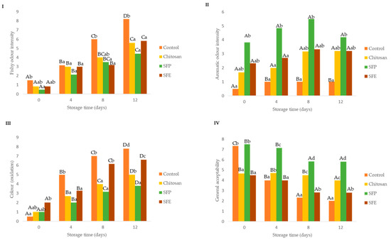 Effect of edible film sensory parameters: fishy odor intensity (I), aromatic odor intensity (II), color (oxidation) (III) and general acceptability (IV) in Atlantic horse mackerel burgers coated with different film formulations (control without coating film, chitosan, sea fennel plant (SFP) incorporated in a chitosan-based film and sea fennel extract (SFE) incorporated in a chitosan-based film) and stored at 4 °C for 12 days. Different uppercase letters indicate significant differences (p < 0.05) over storage time in each treatment. Different lowercase letters indicate significant differences (p < 0.05) due to the treatment.