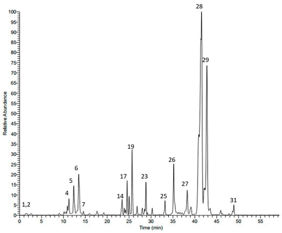 HPLC-MS/MS in the negative mode (ESI (−)) was used to characterize the secondary metabolites of the methanol leaf extract from S. atropurpurea. We tentatively identified 31 compounds based on their molecular weights and fragmentation pattern according to the literature, in-house library, and authentic references. The compounds belong to several classes: phenolic acids, flavonoids, and saponins. The LC-MS profile of the leaf extract is shown in Figure 1 and the chemical composition is presented in Table 1.