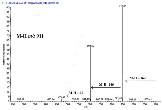 Luteolin 7-O-β-d-glucoside, luteolin 3’-glucoside, luteolin, and chlorogenic acid were isolated from the plant in the current study and were identified based on their LC-MS and NMR data (data are not shown). Three saponins were also annotated based on their molecular weights and mass fragmentation. A compound showed an [M − H]− m/z at 911 and several fragments at 794 [M – H − 162], 603 [M − H − 162 − 146], and 471 [M − H − 162 − 146 − 132]; it was tentatively assigned to maslinic acid-pentosyl-rhamnosyl-glucoside; its spectrum is shown in Figure 2. Another compound showed a molecular ion peak at 1351 and fragments ions at 1027 [M − H − 324], 865 [M − H − 324 − 162], 733 [M − H − 324 − 162 − 146], 587 [M − H − 324 − 162 − 146 − 132]; it was tentatively identified as oleanolic acid-pentosyl-rhamnosyl-pentosyl-glucosyl-di-glucoside. Oleanolic acid-pentosyl-rhamnosyl-glucosyl-glucosyl-di-glucoside was also characterized based on its M − H m/z 1381 and subsequent loss of di-glucoside at m/z 1057 [M − H − 324], m/z 895 [M − H − 324 − 162], m/z 733 [M − H − 324 − 162 − 162], m/z 587 [M − H − 324 − 162 − 162 − 132]. Two precursors showed M − H m/z at 537 and fragment ion at m/z 375; these were assigned to loganic acid glucoside, their retention times are documented in Table 1.