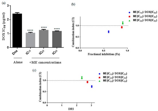 Cytotoxic effect of doxorubicin (Dox) alone or in combination with ME (IC10, IC20, and IC30) against Caco-2 cells for 48 h. (a) IC50 was analyzed by MTT assay **** p < 0.0001 compared to the untreated DMSO control by one-way ANOVA. (b) The combination index (CI) and (DRI) plots were constructed according to the data obtained from the CompuSyn reporting ME (IC10, IC20, and IC30) and Dox combinations. CI values indicate additive (CI = 1), synergistic (CI < 1), and antagonistic (CI > 1) effects. (c) Fractional response (Fa). Data represent the mean ± standard deviation of the mean of 3 independent experiments.