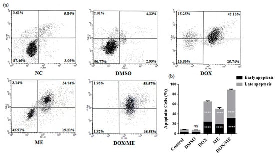 Apoptosis induction in Caco-2 cells. FACS histograms (a) and quantitative analysis of early and late apoptosis (b). Cell populations were stained with Annexin V/PI (the lower left quadrant demonstrates viable cells, upper left quadrant shows early apoptotic, the upper right quadrant represents late apoptotic and the lower right quadrant shows necrotic cells populations). Cells were treated for 48 h with Dox (IC50) or ME (IC50) or with the combination of ME (IC10) and Dox (IC50). Data represent the mean ± standard deviation of the mean of 3 independent experiments; ns (not significant), **** p < 0.0001 compared to the untreated DMSO control by one-way ANOVA.