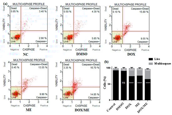 Activation assays of Multicaspase enzyme. (a) The plots illustrate the effect induced by the treatment with Dox (IC50) or ME (IC50) or ME (IC10) combined Dox (IC50) in the Caco-2 cell line after 24h. Each plot is a representative determination figure of the three replicates. (b) The bar charts depict the percentage of live cells and multicaspase enzyme activation. Data represent the mean ± standard deviation of the mean of 3 independent experiments; ns (not significant), **** p < 0.0001 compared to the untreated DMSO control by one-way ANOVA.