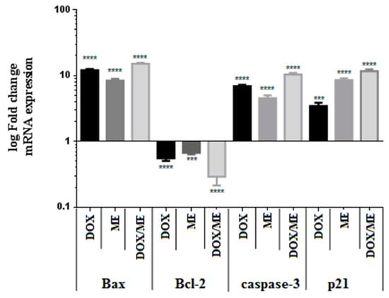 We confirmed, based on the previous results, that ME in combination with Dox increased cytotoxicity against Caco-2 cells by inducing apoptosis. To characterize the corresponding signaling pathways, we studied the ratios of pro-apoptotic and antiapoptotic gene changes in mRNA expression levels of Bax and Bcl-2 families. As shown in Figure 6, ME combined with Dox resulted in a stronger down-regulation of the expression of the antiapoptotic gene Bcl-2 in Caco-2 cells, with a significant decrease after 48 h treatment. mRNA expression levels were calculated based on the calibration curve for the expression level of β-actin. Furthermore, the treatment with ME or Dox alone or their combination demonstrated an increase in proapoptotic gene Bax expression in Caco-2 cells. The analysis showed that the expression levels of caspase-3 (Casp-3) increased by ten-fold in cells treated with the combination drugs in a significant manner compared with untreated control (from 1 to 10.31 ± 0.64-fold change) (Figure 6). Besides, it appears that the mRNA level of p21 was upregulated after treatment with ME alone and when combined with Dox (Figure 6).