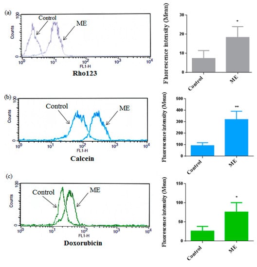 The colorectal cancer cell line, Caco-2 cells, functionally expresses P-gp and MRP1. ABC transporter activities were examined using rhodamine 123 (Rho123), calcein-AM (CAM) and Dox using flow cytometry as previously described [29]. Briefly, Caco-2 cells were seeded at 1 × 105 cells/well in 6-well plates. Then, Caco-2 cells were incubated with 2 µM of CAM or 10 µg/mL Rho123 or 2.41 µg/mL Dox for 2 h, followed by 2 h with the test sample ME (IC50). The fluorescence intensity of the treated cells with ME was compared to the untreated cells.