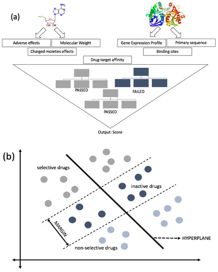 Schematic view of drug development using random forest (RF) (a) and support vector machine (SVM) (b). (a) RF reaches the final decision of drugs by combining the results of randomly-created decision trees (three trees are shown for simplicity). There are multiple features that the computational queries look for in both target and drug. When there is a compatibility match, it proceeds to the next step to match additional features. A series of datasets is inputted into the query, and each tree is responsible for computing a prediction. The prediction picked by most trees is used for the next step. The system of using many decision trees is intended to minimize errors mathematically. (b) SVM utilizes similarities between the classes, called support vectors, to distinguish between the classes based on the trained features. It formulates hyperplanes that separate two classes (can be multiclass, if needed). SVM incorporates multiple training sets depending on the classifiers and formulates compounds’ status (active or inactive). During the process, compounds are separated into three sections: Non-selective compounds (active), selective compounds (active), and in the margin are inactive compounds. Although non-selective compounds are active, they are not selective towards the protein of interest. In contrast, selective compounds are active and selective towards the protein of interest.