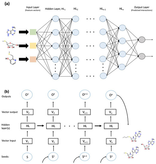 The general scheme of deep neural network (DNN) (a) and recurrent neural network (RNN) (b). (a) DNN consists of an input layer followed by several hidden layers and an output layer. In this case, the input layer utilizes feature vectors generated by a convolutional network. The progression of the NN follows a single path through hidden layer 1 (HL1) to HLn, indicating the feedforward nature of the NN. The generated outputs are often processed using supervised learning techniques for the identification and collection of sensible interactions. (b) RNN begins with a seed, S, which is inputted into the system. Through the use of algorithmic processing, the seed is turned into a reference vector, V1, which is used by the HL to generate a vector output, V2. V2 is subsequently optimized through input training sets and creates the output, O. The generation of these outputs eventually leads to the creation of a gatherable data set. In the meantime, the HLs feed forward to provide information from previous steps. One example is chemical structure generation using SMILE string characters as seeds; hence the desired gathered outputs would be a string of SMILE characters that would be the desired structure. The dataset created in the figure is gathered and analyzed into the resultant molecules.
