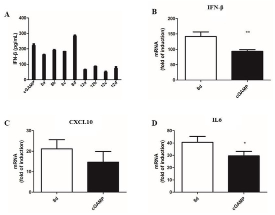 2′,3′-cyclic-guanosine(PS)-5-methylcytidine(PS) (8d). Compound 7d was subjected to a similar procedure to that described for the preparation of 8a to give 8d (41 mg, 30%) as a white solid. 1H NMR (400 MHz, D2O) δ: 7.93 (s, 1H), 7.86 (s, 2H), 7.53 (s, 1H), 6.28 (d, 1H, J = 8.0Hz), 5.89 (d, 1H, J = 8.0 Hz), 5.83 (m, 1H), 5.62 (m, 1H), 5.51 (m, 1H), 5.25 (m, 1H), 4.55 (d, 1H, J = 4.0 Hz), 4.50–4.53 (m, 2H), 4.30–4.41 (m, 4H), 4.02–4.13 (m, 2H), 2.93–2.99 (m, 2H), 1.29 (s, 3H). 31P NMR (162 MHz, D2O) δ: 54.99, 53.26. HRMS (ESI-TOF−) Exact mass for C20H26N8O12P2S2 (M-H)−, Calculated 696.0587; found 695.0482.