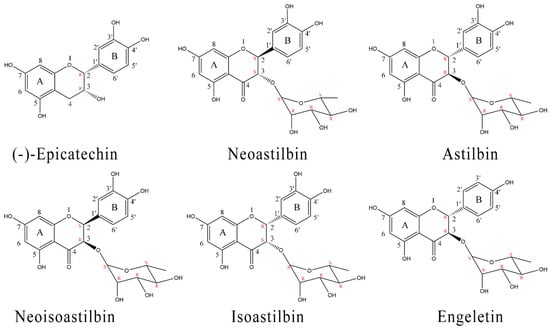 Astilbin is a flavonoids compound. Previous studies have shown that astilbin was the main compound in S. glabra. However, the other stereoisomers of astilbin (isoastilbin, neoisoastilbin, neoastilbin) are naturally low in content []. Thus, this study aimed to isolate and prepare the flavonoids compounds from a standardized S. glabra flavonoids extract (SGF), instead of S. glabra raw material. We isolated and prepared six flavonoids using PHPLC from SGF: astilbin, neoastilbin, isoastilbin, neoisoastilbin, engeletin and (−)-epicatechin. The content of these six flavonoids was 18.10%, 11.04%, 5.03%, 4.09%, 2.58% and 1.77%, respectively. All the purities of these flavonoids were more than 95% which determined by UPLC. The results showed that astilbin was still the main chemical component in SGF. However, the percentage of the other three stereoisomers of astilbin in SGF was higher than in the raw material.