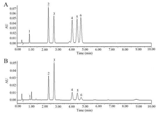 Quantitative analysis of six flavonoids in Smilax glabra flavonoids extract (SGF) by ultra-high-pressure liquid chromatography (UPLC). (A) Standards (purity ≥ 98%); (B) SGF sample. Compounds 1, 2, 3, 4, 5 and 6 represent for (−)-epicatechin, neoastilbin, astilbin, neoisoastilbin, isoastilbin and engeletin, respectively.