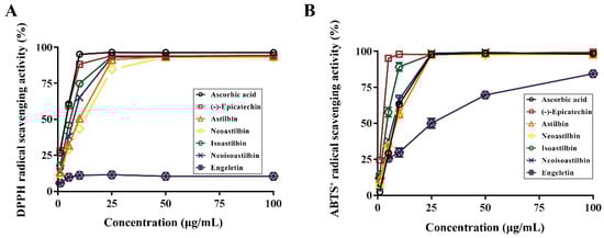 Some studies have shown that astilbin had good effects in the treatment of various diseases [,,]. However, there were few studies on the pharmacological roles of the other chemical constituents in S. glabra. Excess radicals and oxidative stress caused a variety of diseases in the body. Previous investigations have indicated that reducing radicals could effectively prevent the occurrence of oxidative stress related diseases [,,]. Thus, this study evaluated the antioxidant capacities of six flavonoids in SGF by determining the DPPH radical scavenging activity, the ABTS+ radical scavenging activity, as well as the ferric reducing antioxidant power (FRAP). The results showed that most of the isolated flavonoids had strong antioxidant activity. Among them, (−)-epicatechin, isoastilbin and neoisoastilbin showed stronger antioxidant activity than astilbin. The isomerism of natural compounds may affect their pharmacological activity to some extent []. The four stereoisomers of astilbin based on the C-2 and C-3 configuration, which is categorized in 4 stereoisomers: astilbin (2R,3R), neoisoastilbin (2S,3R), isoastilbin (2R,3S) and neoastilbin (2S,3S). The trans-stereoisomers of astilbin (neoisoastilbin, isoastilbin) showed higher antioxidant activities than cis-stereoisomers (astilbin, neoastilbin). Moreover, structure-activity studies of flavonoids indicated that the substitution patterns of B-ring could affect the antioxidant capacity []. The chemical structures of these flavonoids showed that the four stereoisomers of astilbin have 3′-OH and 4′-OH on B-ring, and the engeletin only has 4′-OH on B-ring. In addition, engeletin had no obvious antioxidant activity in DPPH radical system and showed low activities in ABTS+ radical scavenging and the FRAP evaluation, which indicated that 3′-OH on B-ring of flavonoids is more important to the antioxidant capacity.