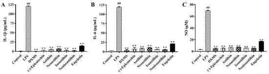 RAW 264.7 cells were cultured in Dulbecco’s Modified Eagle Medium (DMEM) contained with 10% fetal bovine serum (FBS), 100 µg/mL streptomycin and 100 U/mL penicillin. The cell suspension (1 × 105 cells/mL) was added to a 96-well plate (100 µL/well) at 37 °C, 5% CO2 for 24 h, then treated with 100 μM (−)-epicatechin, neoastilbin, astilbin, neoisoastilbin, isoastilbin or engeletin for 0.5 h, followed by stimulated with LPS (1 μg/mL) and incubated for another 6 h. Dexamethasone (DXMS, 5 μM) as positive control [].