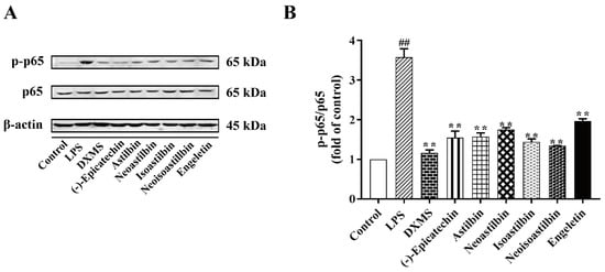 The anti-inflammatory activity of six flavonoids in SGF on LPS-stimulated RAW264.7 cells was investigated by measuring IL-1β, IL-6 and NO concentrations in cell culture supernatant. As shown in Figure 5, we found LPS increased the concentrations of IL-1β, IL-6 and NO significantly. (−)-Epicatechin, astilbin, neoastilbin, isoastilbin, neoisoastilbin and engeletin showed strong anti-inflammatory capacities compared to the LPS-stimulated RAW264.7 cells (p < 0.01). To further clarify the anti-inflammatory mechanism of six flavonoids, we determined the protein expression of NF-κB p-p65 in RAW 264.7 cells. As shown in Figure 6, LPS has induced NF-κB activation, which showed the protein expression of phosphorylated p65 (p-p65) in LPS-stimulated RAW264.7 cells increased significantly. (−)-Epicatechin, astilbin, neoastilbin, isoastilbin, neoisoastilbin and engeletin had obvious inhibitory effects on the protein expression of p-p65 (p < 0.01).