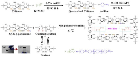 Scheme for the formation of quaternized chitosan (QCS)–polyaniline/oxidized dextran hydrogel. GTMAC is the abbreviation of glycidyltrimethylammonium chloride [18]. Reprinted from [18] with permission from Elsevier.