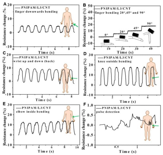 Relative resistance changes for N-isopropylacrylamide (PNIPAM)/laponite (L)/carbon nanotube (CNT) hydrogels of (A,B) index finger two direction bending, (C) wrist motions, (D) knee bending, (E) elbow bending, and (F) pulse detection [8]. Reprinted from [8] with permission from American Chemical Society.