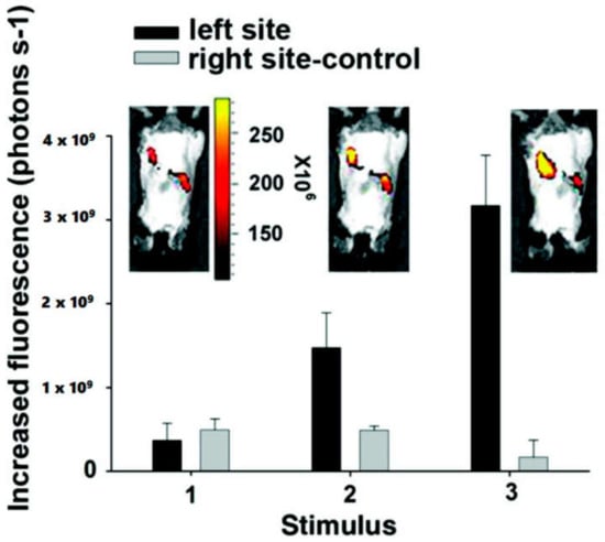 Fluorescent images of the implanted conductive hydrogel in vivo under an electric field of −1.5 V/cm. The labels on the X-axis represent (1) before applying electric field and (2,3) after applying electric field on the left site of the imaged animals. The right side of each image is the control side without applying any electric field [72]. Reprinted from [72] with permission from American Chemical Society.