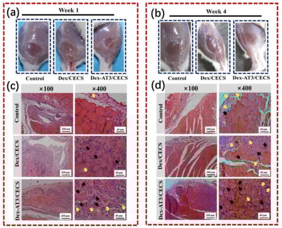 In vivo evaluation of skeletal muscle tissue regeneration in a muscle loss injury rat model. The morphology of tibialis anterior muscle after injury and treatment for 1 week (a) and 4 weeks (b); hematoxylin and eosin staining images of hydrogels and PBS control after implantation for 1 week (c) and 4 weeks (d). Black arrows represent centronucleated myofibers and yellow arrows represent newly formed blood vessels. Reprinted with permission from [31]. Reprinted from [31] with permission from Elsevier.
