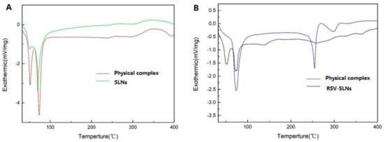 DSC heating curves of physical complex SLNs and SLNs (A); physical complex RSV-SLNs and RSV-SLNs (B) from 0 to 400 °C.