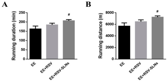 Effect of RSV-SLNs on running exhausted time (A) and running distance (B) of mice. Data are expressed as mean ± SD of six mice in each group. # p < 0.05 compared with EE group. EE: exhaustive exercise group; EE + RSV: exhaustive exercise combined with resveratrol supplementation; EE + RSV-SLNs: exhaustive exercise combined with RSV-SLNs supplementation.