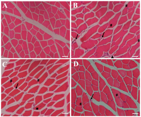 RSV-SLNs relieves skeletal muscle injury induced by excessive endurance exercise. Cross-sections of the histological photomicrography of GAS muscles with HE staining from the four groups of mice. (A): sedentary control (SC); (B): exhaustive exercise group (EE); (C): exhaustive exercise combined with resveratrol supplementation (EE + RSV); (D): exhaustive exercise combined with RSV-SLNs supplementation (EE + RSV-SLNs). The black arrow denotes inflammatory cell infiltrate; triangle refers to myonecrosis; square corresponds to centrally nucleated fibers; and pound sign indicates edema. The scale bars represent 200 µm in skeletal muscle.