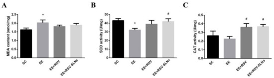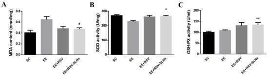 RSV-SLNs attenuates lipid pro-oxidant status during excessive endurance exercise. (A) MDA content. Antioxidant enzyme levels of (B) SOD and (C) CAT in the skeletal muscle from four groups of mice: sedentary control (SC), exhaustive exercise group (EE), exhaustive exercise combined with resveratrol supplementation (EE + RSV), exhaustive exercise combined with RSV-SLNs supplementation (EE + RSV-SLNs). * (p < 0.05) vs. SC group; # (p < 0.05) vs. EE group. MDA: malondialdehyde; SOD: superoxide dismutase; CAT: catalase.