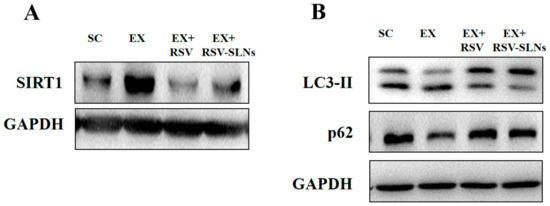 Furthermore, the expression levels of microtubule-associated protein 1 light chain 3-II (LC3-II) and sequestosome-1 (SQSTM1/p62) were investigated to verify RSV-SLNs regulates accumulation of SIRT1 via the autophagic pathway. The Western blot analysis showed that the LC3-II and p62 protein expression levels significantly decreased after long-term endurance exercise (p < 0.05), whereas the increase in the levels of LC3-II and p62 protein expression was determined after RSV-SLNs administration (p < 0.05) (Figure 8B).