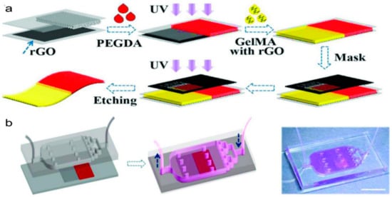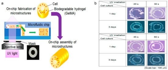- Takeuchi, M.; Kozuka, T.; Kim, E.; Ichikawa, A.; Hasegawa, Y.; Huang, Q.; Fukuda, T. On-Chip Fabrication of Cell-Attached Microstructures using Photo-Cross-Linkable Biodegradable Hydrogel. J. Funct. Biomater. 2020, 11, 18. [Google Scholar] [CrossRef] [PubMed]