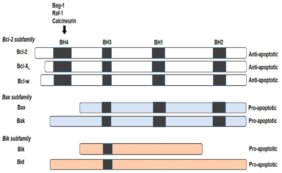 Proteins included in the Bcl-2 protein family are based on sequence homology of the founding member Bcl-2, in the four homologies of the BH region. Most members have a multiple binding membrane region on their carboxyl termini that facilitates binding of the proteins, and its location is on the MOM or to the endoplasmic reticulum (ER) membrane [11,12,13]. The BH4, together with BH1, BH2, and BH3 regions, is required for anti-apoptotic activity. Proteins like Bag-1, Raf-1 and calcineurin also modulate Bcl-2 activity by binding to the N-terminal BH4 domain region, to mediate anti-apoptotic function. The BH3 region has an affinity for Bax and Bak, which facilitate apoptotic cell death induction [14,15]. Furthermore, recent findings have highlighted the dual activities of the BH3 region in death agonist and antagonist manner. This means that the BH3 region of Bax can also bind to the Bcl-2 in a competitive manner, depending on their concentration, suggesting sequence similarities in the BH3 domain of the anti-apoptotic and apoptotic member proteins [10].