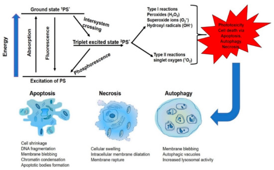 The photosensitizer that initiates the photochemical reaction always exists in the ground state, and upon specific wavelength light exposure, it absorbs light photon and becomes excited in singlet unstable state (1PS*). The 1PS* is unstable in the sense that it has a short half-life, and through fluorescence emission, it returns to the ground state or undergoes intersystem crossing to a long-lived triplet excited state (3PS*). This new excited triplet state can also return to the ground state through phosphorescence, or be combined with molecular oxygen in a photochemical reaction, to induce phototoxicity. In the photochemical reaction (type I), the 3PS* reacts directly by electron or hydrogen biomolecules transfer, to form peroxides, superoxide ions and hydroxyl radicals. Meanwhile, in (type II), the 3PS* undergoes chemical reaction with molecular oxygen (3O2) to produce the singlet oxygen (1O2). The 1O2 generated is a very toxic activated oxygen molecule that is the key to the photo-cytotoxicity reaction followed by the PDT treatment, because of its interaction with proteins, nucleic acids and lipid biomolecules [34]. The photo-destruction of the cancerous tissue/cells by the highly reactive ROS molecules has a multifactorial impact that can lead to the tumor destruction via apoptosis and/or autophagy and/or necrosis (Figure 2). One of the protective mechanisms to the cellular response of PDT is the upregulation of antioxidant haem oxygenase-1 against oxidative stress. This antagonizes PDT treatment by scavenging ROS production and combination treatment with cellular antioxidant inhibitors; hydroperoxide degradation will especially boost ROS accumulation and enhance PDT cytotoxicity in the treatment of resistant cells [35,36].