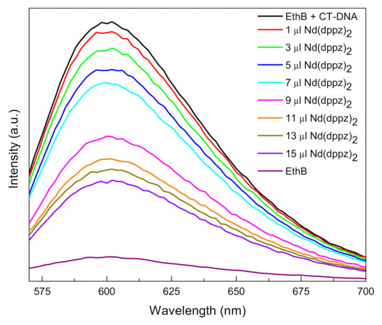 APA StyleSavić, A., Kaczmarek, A. M., Van Deun, R., & Van Hecke, K. (2020). DNA Intercalating Near-Infrared Luminescent Lanthanide Complexes Containing Dipyrido[3,2-a:2′,3′-c]phenazine (dppz) Ligands: Synthesis, Crystal Structures, Stability, Luminescence Properties and CT-DNA Interaction. Molecules, 25(22), 5309. https://doi.org/10.3390/molecules25225309