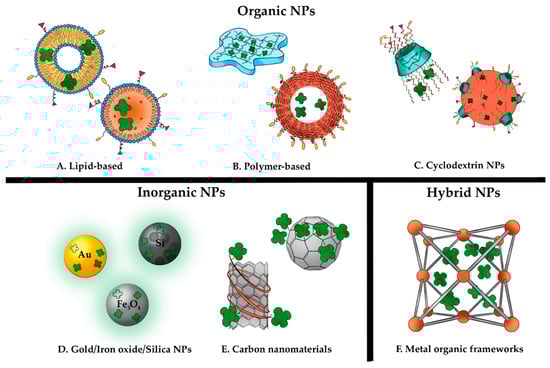 Types of nanoparticles (NPs) that have been used to improve PS (depicted by green) solubility, bioavailability and tumor targeting: (A) lipid-based NPs (liposomes and solid lipid NPs), (B) polymer-based NPs (hydrogel and PNPs), (C) cyclodextrin NPs, (D) inorganic NPs (Au, Fe and Si-NPs), (E) carbon nanomaterials (carbon nanotubes and fullerene) and (F) metal organic frameworks.