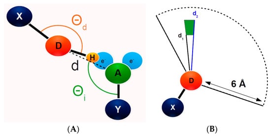 However, even when high-quality experimental data is available, such as from atomic (better than 1 Å) resolution crystal structures or neutron diffraction data, many hydrogen atoms are still poorly localized, especially for side chain atoms in which the hydrogen atom has rotational freedom []. While these methods (and NMR) are capable of producing experimental evidence for hydrogen atoms, to date, the vast majority of protein structural information has been collected using x-ray crystallography (with a gradually increasing average resolution) []. To address this problem, we sought out a method that could investigate these kinds of interactions and utilize the large amount of available protein crystallographic data. We used a geometric definition that relies solely on the position of the non-hydrogen heavy atoms and relies on the basic principle that energetically favorable interactions will tend to be statistically overrepresented among all possible geometric conformations, a principle that is recognized in the IUPAC definition of hydrogen bonding []. Because the definition introduced here relies only on heavy atom geometry (Figure 1), we could not only look at traditional hydrogen bonds but also non-canonical interactions such as CH-π bonds []. While the existence of these bonds is not without controversy, we also acknowledge that lacking explicit detail on the position of a hydrogen atom makes it difficult to differentiate hydrogen bonding and salt bridge interactions [,,], so we refer to all of these collectively (e.g., canonical hydrogen bonds [,], water-mediated hydrogen bonds [], salt bridges [,,], Ar-H [,,], and ion-π [] interactions) as hydrogen-mediated interactions (HMI). By examining high-resolution crystal structures using this method, we were able to identify at least one favored geometry for all the expected donor atom types in the Protein Data Bank (PDB) [] and produce a simple method to estimate HMI quality in current and future protein structures that is readily applicable to side chain interactions and does not necessitate the use of experimental or predicted hydrogen atoms but rather utilizes the much more experimentally accessible heavy atom geometry.