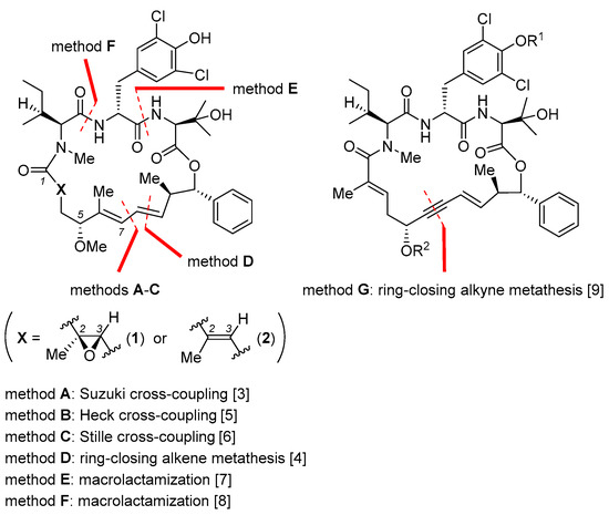 Key macrocyclization reactions (methods A–G) employed for the total synthesis of 1 and/or 2 [3,4,5,6,7,8,9].