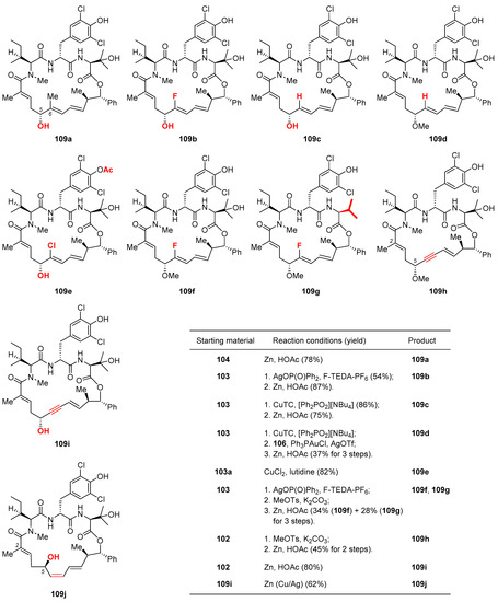 Novel nannocystins 109a–109j prepared during Fürstner’s motif-oriented total synthesis of 2 [9]. The inset table catalogs their preparation conditions.