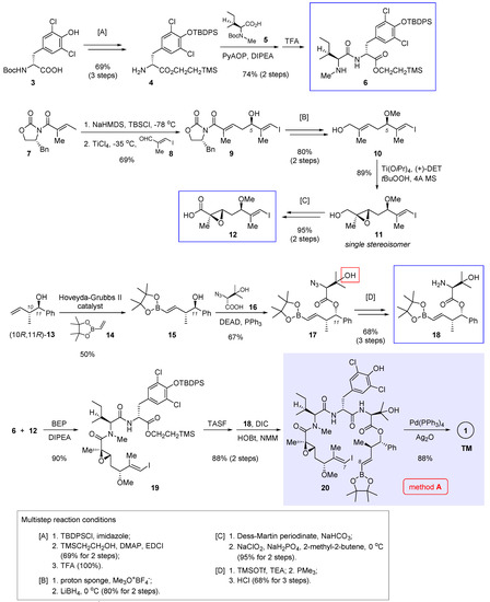 Starting with commercially available L-tyrosine derivative 3, a three-step protecting group manipulation (multistep reaction condition [A] at the bottom of Scheme 1) revealed the free amine of 4 for subsequent amide coupling with N-Boc-N-methyl-L-isoleucine 5. Boc deprotection gave dipeptide 6 as the first building block. Next, TiCl4-mediated vinylogous Mukaiyama aldol condensation [11,12,13,14] was implemented between a vinylketene silyl N,O-acetal derived from 7 and (E)-3-iodo-2-methylacrylaldehyde (8), affording chiral secondary alcohol 9 in 69% yield. Methylation of the nascent 5R hydroxyl group, followed by reductive cleavage of the oxazolidinone auxiliary ([B]), gave rise to allylic alcohol 10. Then Sharpless asymmetric epoxidation came into play and furnished chiral epoxide 11 as a single stereoisomer. Such prepared chiral epoxy alcohol was further converted to the second key fragment 12 via stepwise oxidation ([C]).