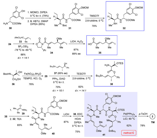 Liu’s approach makes use of three fragments 32, 35, and 38 (boxed in Scheme 3) to assemble the entire molecule. First, MOM protection of chlorinated tyrosine methyl ester 30 and then amide condensation with 5 (structure shown in Scheme 1) gave, after Boc removal, dipeptide 32 as the first building block. Second, vinylogous Mukaiyama aldol reaction, which is instrumental for asymmetric C-C bond formation in the preceding two syntheses (see Section 2 and Section 3) [3,5], again played a key role in the preparation of α,β-unsaturated carboxylic acid 35; but a somewhat differing aspect of Liu’s synthesis is the use of dimethyl acetal 33, instead of previously used aldehyde 8 (see Scheme 1), as the electrophilic coupling partner. Thanks to the robustness of Kobayashi’s methodology [11] and subsequent improvement by Hosokawa [14,21,22], the reaction produced 34 in 88% yield with a high level of stereoselectivity (diastereomeric ratio (d.r.) = 14:1). Alkaline hydrolysis aided by hydrogen peroxide cleaved the auxiliary portion to give 35 in 89% ee as the second necessary building block. Preparation of the last building block 38 entailed as the first step an environment-friendly iron-catalyzed oxidation [23] that converted 36 to 25 (structure in Scheme 2) in 76% yield. In the meantime, trans homoallylic alcohol 37 was synthesized in 85% ee in accordance with Roush’s asymmetric crotylboration method [24]. The following Mitsunobu esterification built the hindered ester linkage between 25 and 37. Since the use of protonic acids caused undesirable destannylation, Boc cleavage called for an alternative condition (TESOTf, 2,6-lutidine) to obtain 38 with a diastereomeric ratio of 14:1.