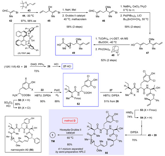 - Tian, Y.; Wang, J.; Liu, W.; Yuan, X.; Tang, Y.; Li, J.; Chen, Y.; Zhang, W. Stereodivergent total synthesis of Br-nannocystins underpinning the polyketide (10R,11S) configuration as a key determinant of potency. J. Mol. Struct. 2019, 1181, 568–578. [Google Scholar] [CrossRef]