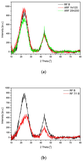Comparing the XRD patterns of the samples obtained under the same conditions but with (RF_7/1) or without (RF) potassium oxalate (Figure 2b), it was found that both the intensity of 002 peak and 100 peak for the activated material decreased. This behavior was observed for all the samples regardless of the process conditions. It can indicate that the graphitization degree was reduced in the presence of the activator, which is consistent with the results obtained using scanning electron microscopy.