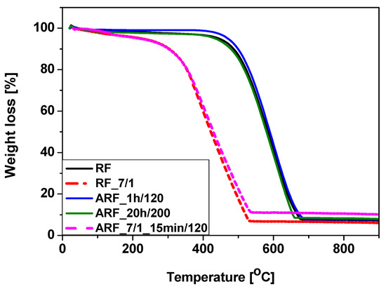 Thermal stability of the samples was studied using a thermogravimetric method, and the thermogravimetric curves are presented in Figure 3. It is clearly visible that the materials activated with potassium oxalate (RF_7/1 and ARF_7/1_15 min/120) have a lower initial combustion temperature than unmodified samples (RF, ARF_1 h/120, and ARF_20 h/200). This can be related to the presence of oxygen functional groups on the carbon spheres surface derived from potassium oxalate and the presence of the amorphous carbon [40]. The lower thermal stability of modified oxalate potassium samples may also result from the fact that, during synthesis, potassium hollows out carbon spheres, creating additional channels with pores. Arising from additional channels on the surface of the spheres, oxygen has easier access to a larger surface of the sample during the thermogravimetric test, which could be the reason for combustion at lower temperatures.
