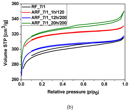 The N2 adsorption data show these samples have significant macro-micropore structure. Materials produced in this study show mixed I type and II isotherms according to IUPAC classification. Figure 4a shows exemplary nitrogen adsorption isotherms of the unmodified materials. Samples produced without heat treatment adsorbed the lowest amount of nitrogen. With increasing heat treatment time, the amount of the adsorbed nitrogen also increased. Nonetheless, materials obtained using a shorter time for heat treatment show isotherm types more similar to type I, which is characteristic of the microporous materials. With increasing reaction time, the adsorption isotherms were more of type II for the samples in the autoclave for 20 h, suggesting a high proportion of macropores. Increasing reaction time in carbonaceous materials develops the macropores. Type II isotherms also represent unrestricted monolayer-multilayer adsorption. Isotherms similar to those shown here can be assigned to physisorption of N2 gases on nonporous or macroporous adsorbents. Interestingly, all samples have an H4 type hysteresis loop. This may indicate the presence of narrow slit pores in the samples. H4 loops are often found in micro-mesoporous carbons [43,44].