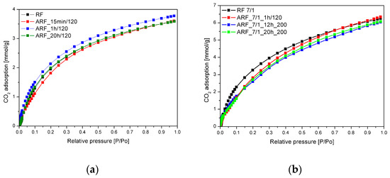 Compared to unmodified materials, the addition of potassium oxalate resulted in a development of the specific surface area (Table 1). In the samples unmodified with potassium oxalate, the specific surface area was practically constant, between 462 and 486 m2/g. In these materials, time and temperature of the process did not affect the value of the specific surface area. Addition of potassium oxalate to the carbon materials during synthesis led to the development of specific surface area, up to 986 m2/g (sample ARF_7/1_20 h/200). This is probably due to the carbonization of samples at 700 °C, where potassium ions are considerably intercalated into the carbon spheres to form pores [45,46,47]. The additional pores created in this way increased the specific surface area of the obtained samples and their adsorption capacity. The existence of interconnecting macropores and tunnels could be beneficial for CO2 adsorption.