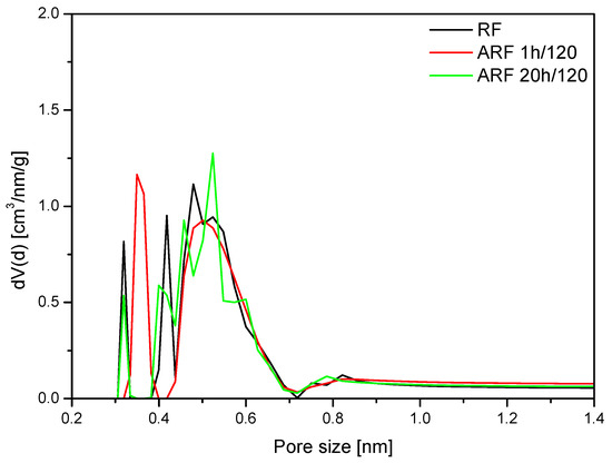 Figure 7 shows the PSD of unmodified samples obtained at different conditions. Pore size distributions of all samples are similar. A high content of pores in the range 0.3–0.4 nm and 0.4–0.6 nm can be observed. Similar pore size distributions of the samples correspond to the similar CO2 adsorption values.