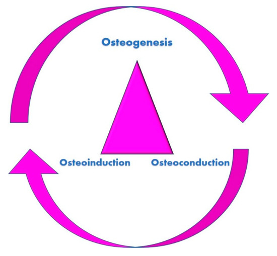 The osteoconduction properties are provided by the scaffolds, which represent the structures that allow cellular replication and tissue development. The osteogenic properties are due to the presence of osteoblasts producing the extracellular matrices and the osteoinduction is stimulated by the growth factors starting a series of events leading to the regeneration process [14] (Figure 1).